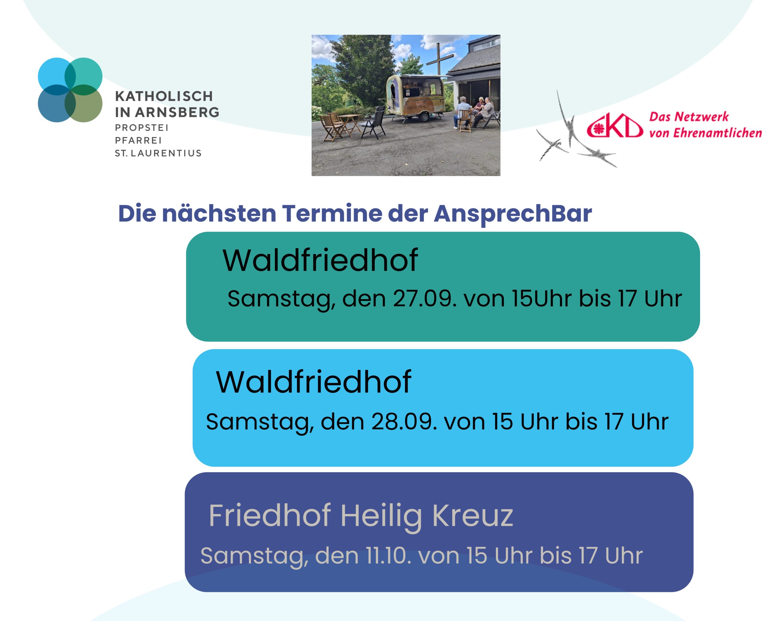 Die AnsprechBar ist ist wieder zu den genannten Terminen auf den Friedhöfen zu finden. Der Name ist Programm. Kommen Sie ins Gespräch und lassen sich bei einer Tasse Kaffee auf ein Gespräch über Gott und die Welt verführen.